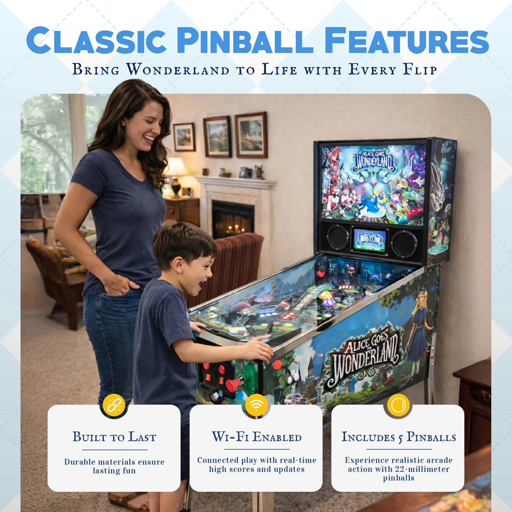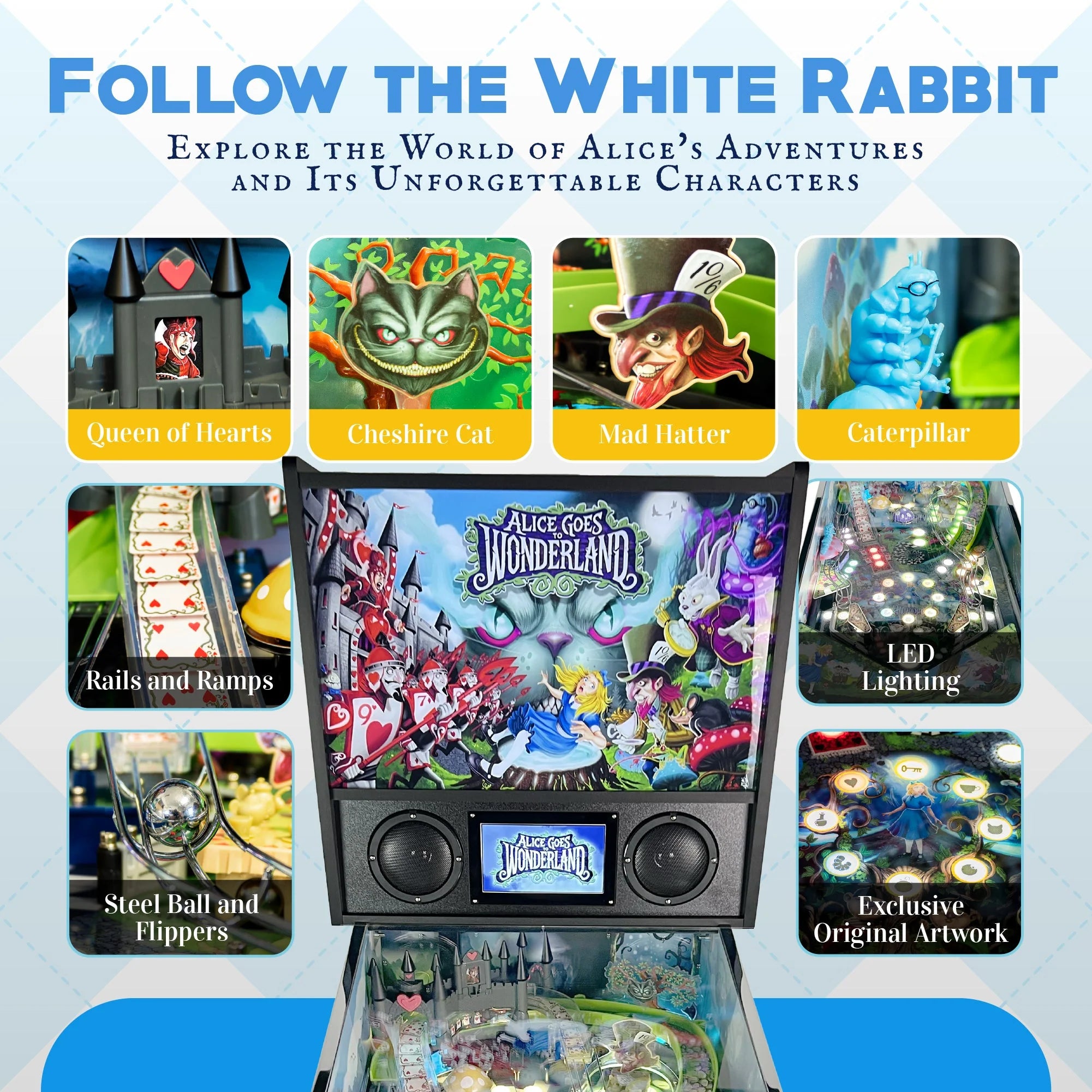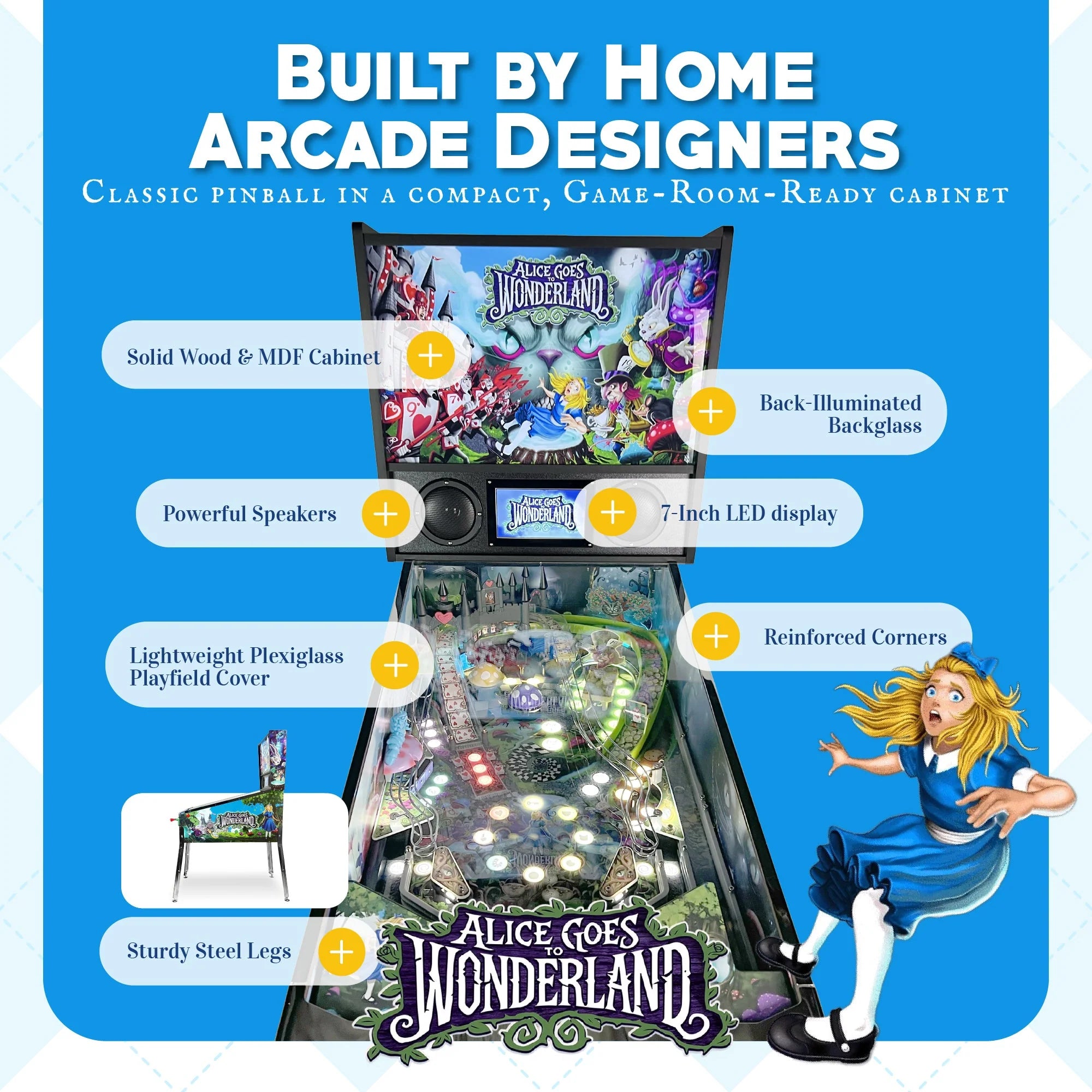 Alice Goes to Wonderland Pinball is a fully mechanical home pinball machine that puts players in the middle of a fast-paced quest to rescue Alice from the depths of Wonderland. Navigate a series of bizarre and whimsical challenges assigned by the Mad Hatter, Cheshire Cat, White Rabbit, and other curious characters, all while triggering real flippers, bumpers, spinners, and modern game code. With multiball action, LED lighting, and custom art, it delivers an authentic pinball experience in a compact, affordable cabinet built for home arcade fans.